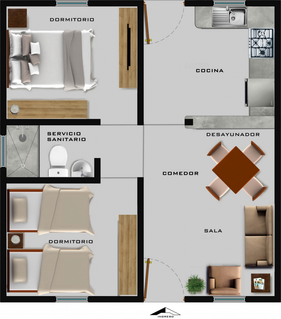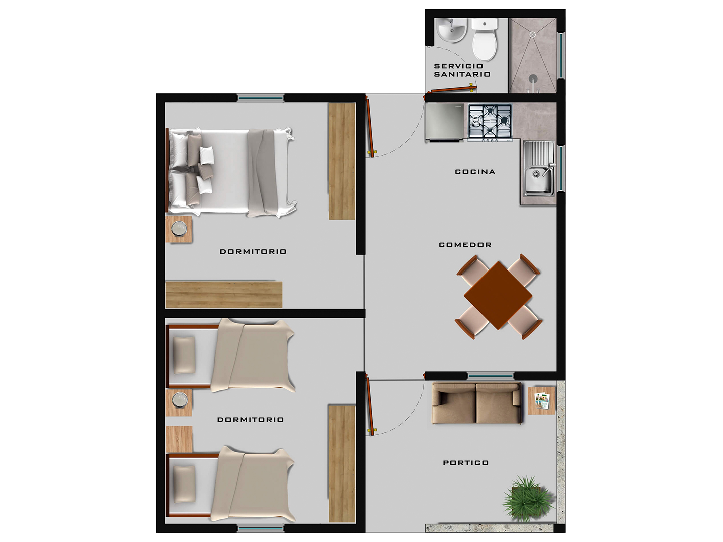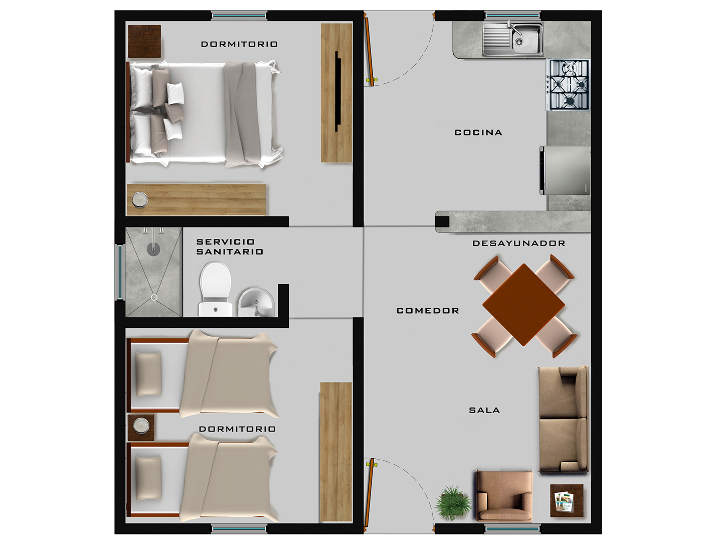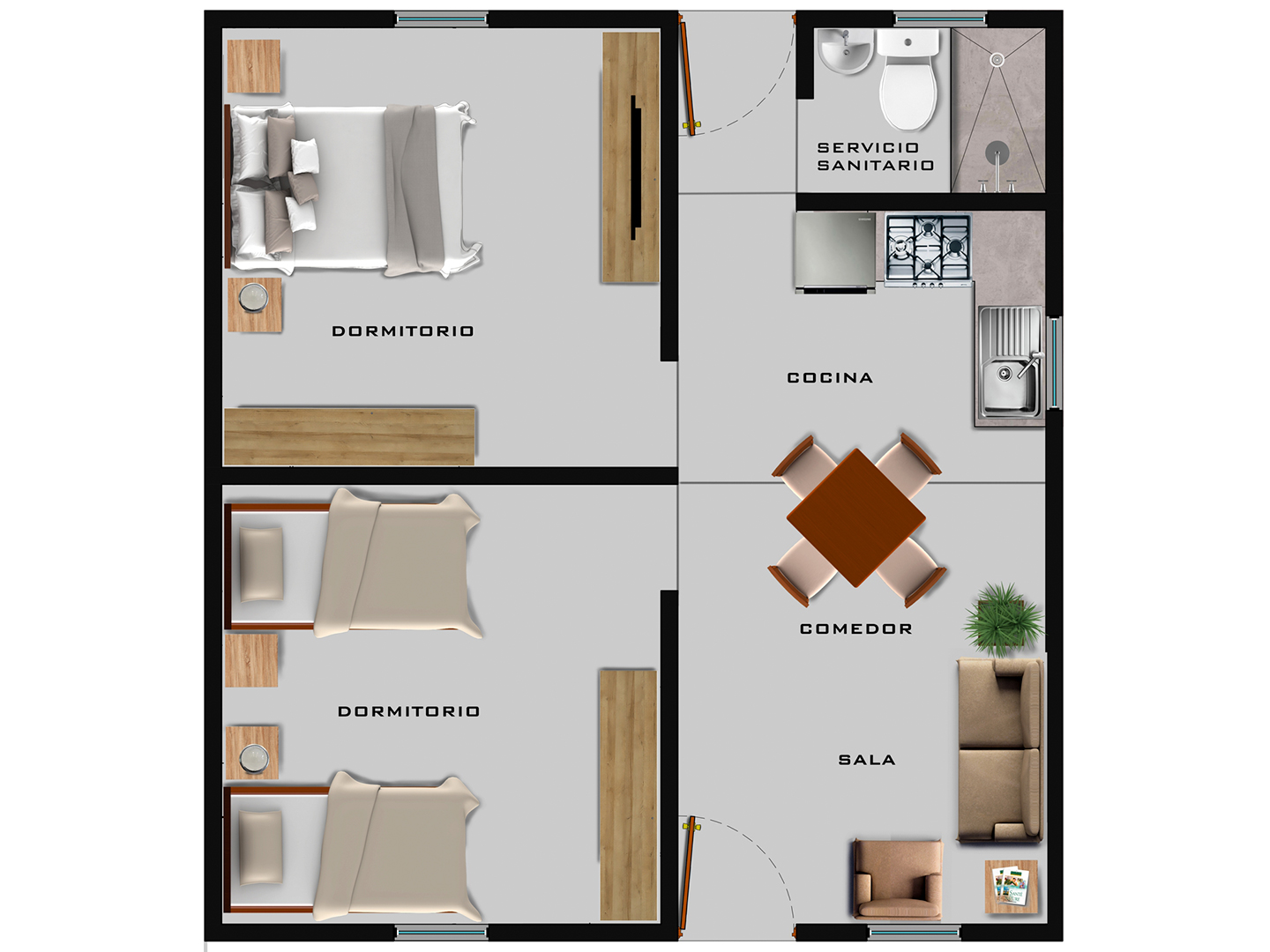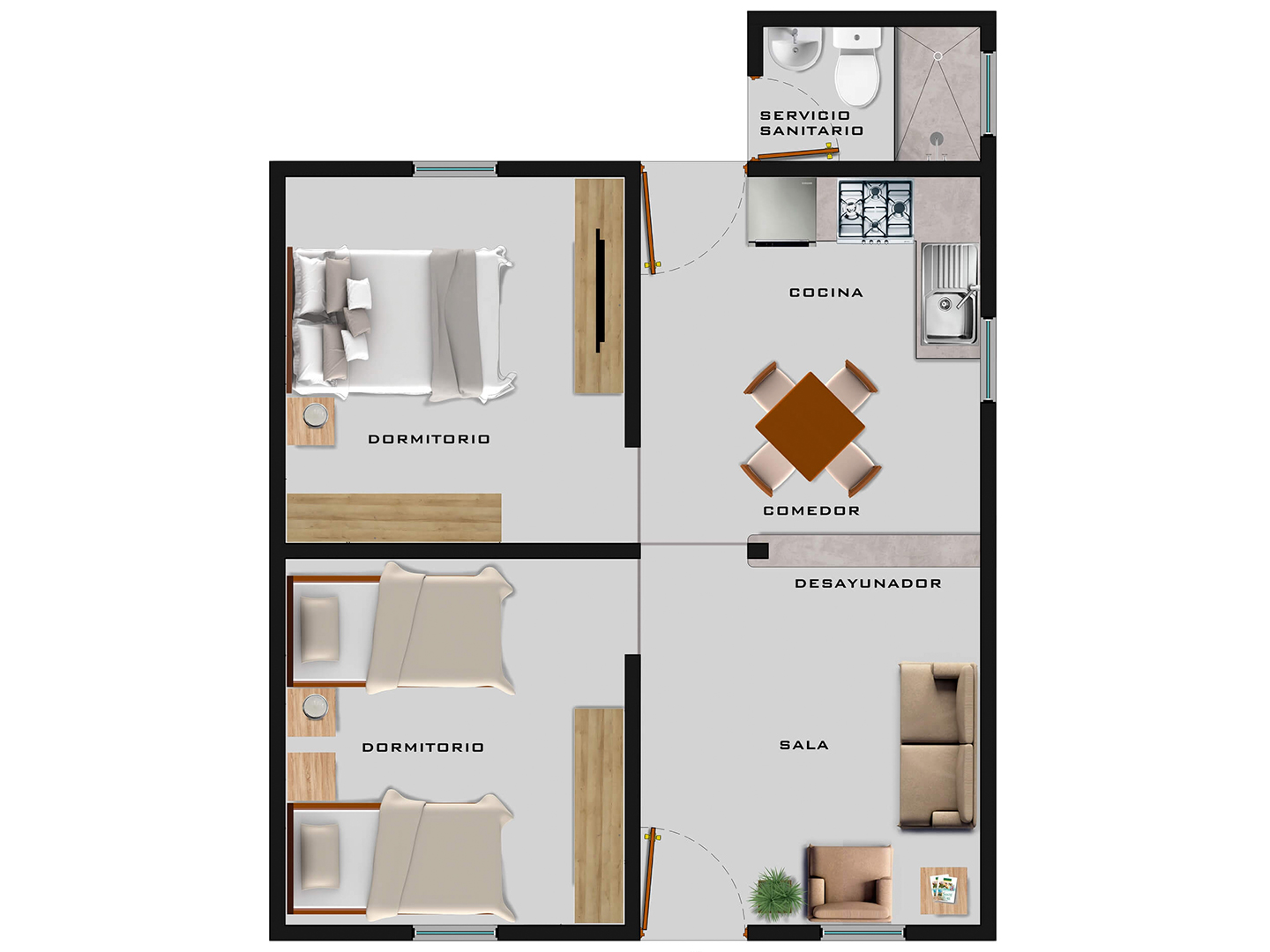 Sala-comedor-cocina, 2 dormitorios, servicio sanitario.